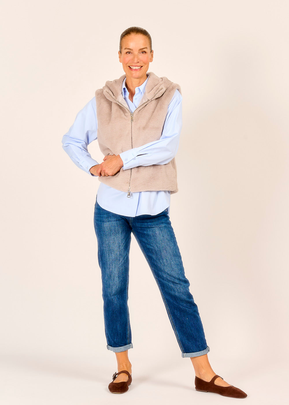 Grigiofarbenes Kunstfell umhüllt Sie wie eine sanfte Wolke aus Luxus und sorgt für einen Hauch zeitloser Eleganz. Die Kapuze verleiht dem Look eine moderne, lässige Note, während die klare Silhouette die perfekte Alternative zum klassischen Blazer bietet. Ob drinnen beim Meeting oder draußen beim Stadtbummel – diese Weste macht jedes Outfit sofort besonders. Ein Statement-Piece voller Stil, Komfort und selbstbewusster Raffinesse, das Sie nicht mehr missen möchten.