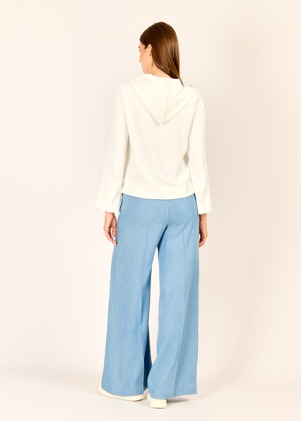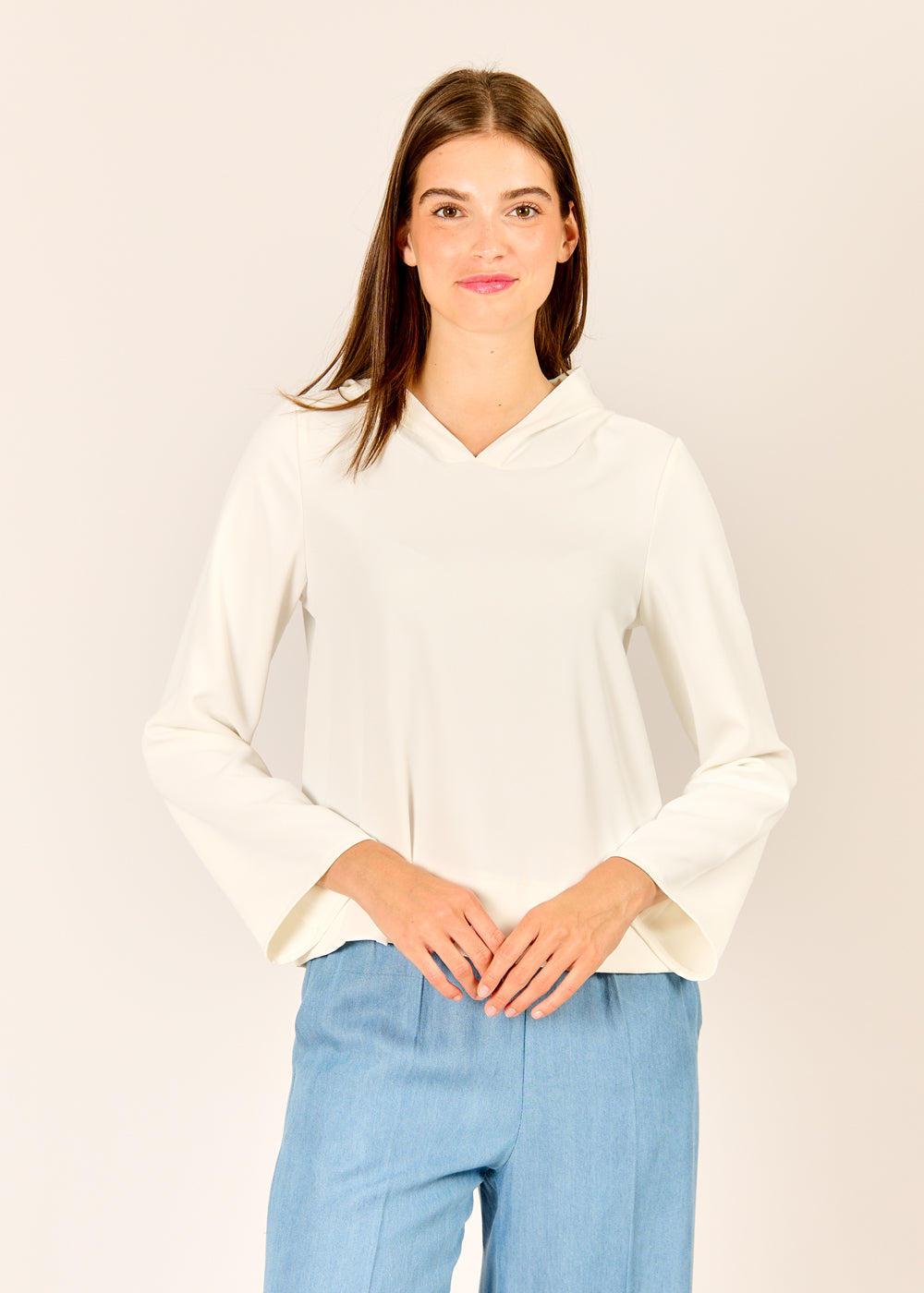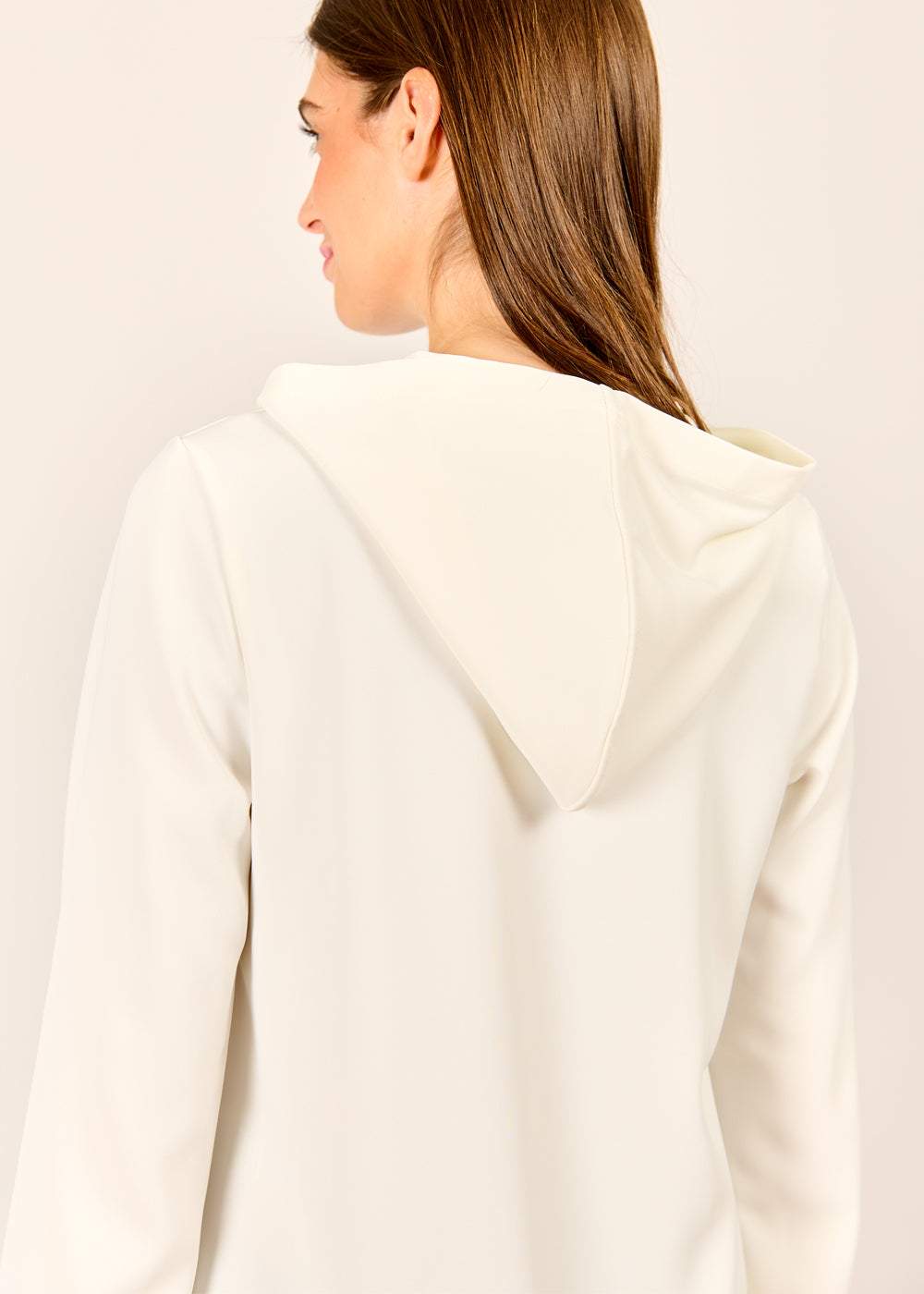 Dieses elegante Kapuzenshirt in strahlendem Bianco Ottico ist die perfekte Kombination aus sportlichem Chic und femininer Raffinesse. Die fließende Silhouette und die weite Passform sorgen für einen modernen Look und höchsten Tragekomfort, während die feine Qualität das Design aufwertet. Ein vielseitiges Essential, das sich ideal für lässige, aber dennoch elegante Alltagsoutfits eignet.