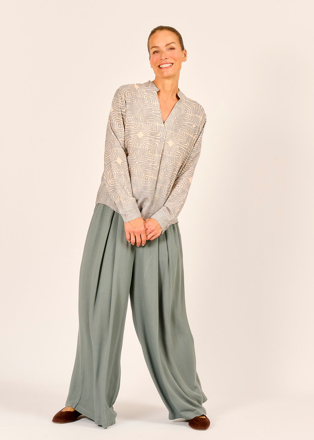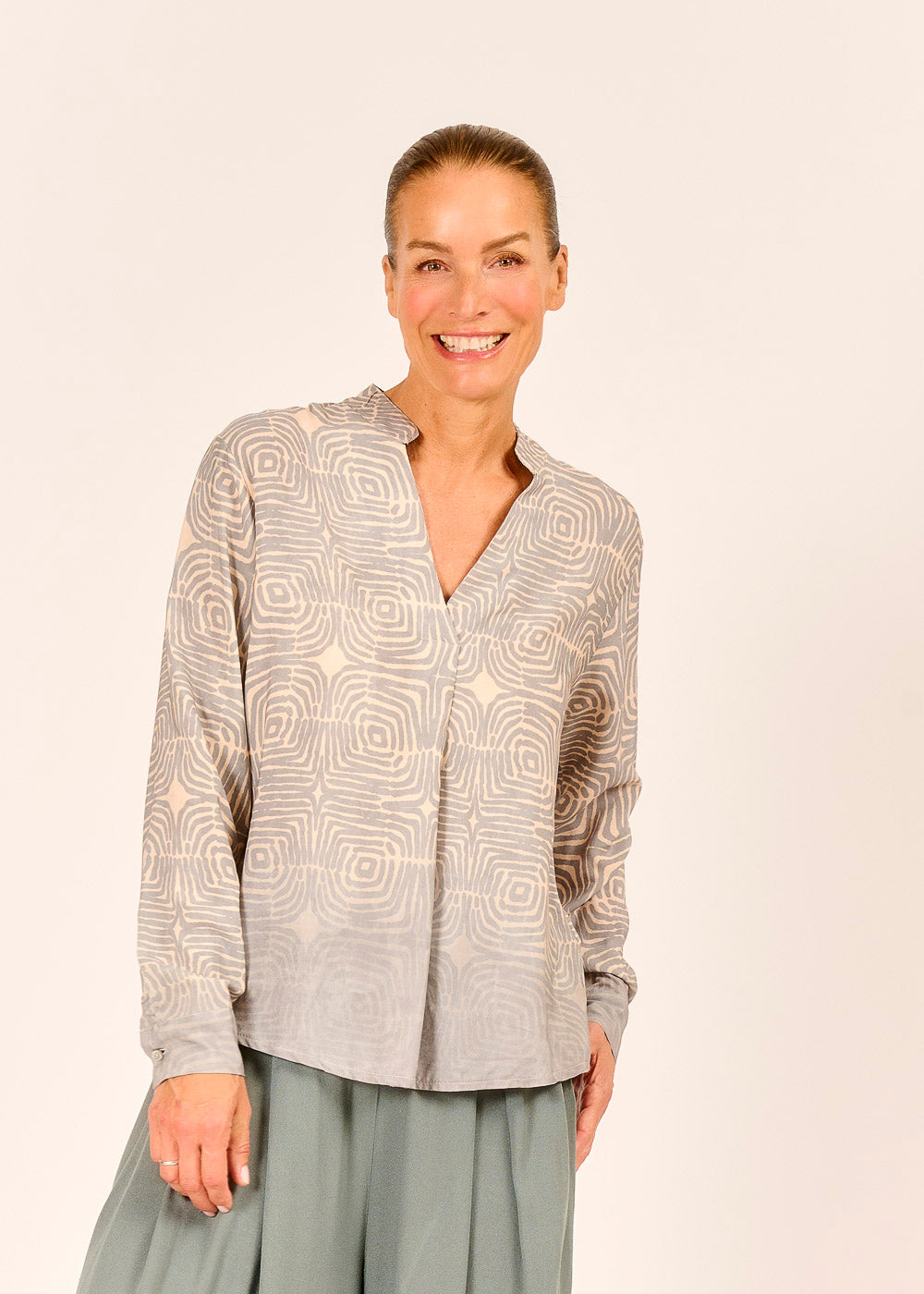 Diese Tunikabluse verführt mit einem faszinierenden Muster, das wie ein geheimnisvolles Labyrinth wirkt und den Blick immer wieder aufs Neue fesselt. Der fließende Schnitt sorgt für mühelosen Tragekomfort und unterstreicht die feminine Silhouette auf elegante Weise. Ein einzigartiges Statement-Piece, das Kunst und Mode auf spielerische Weise verbindet.