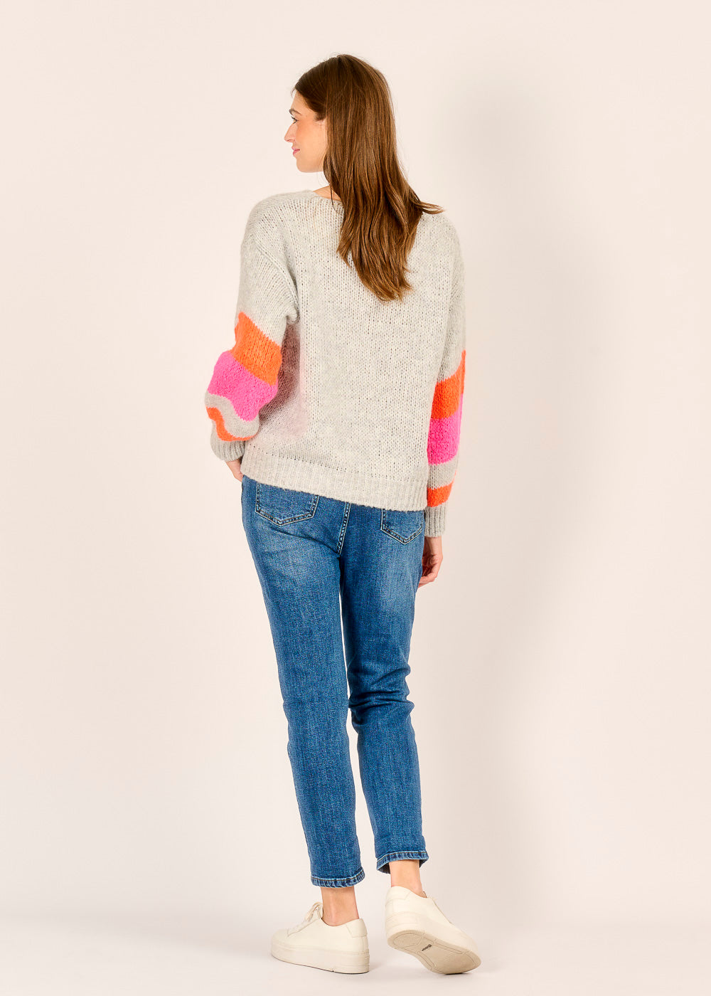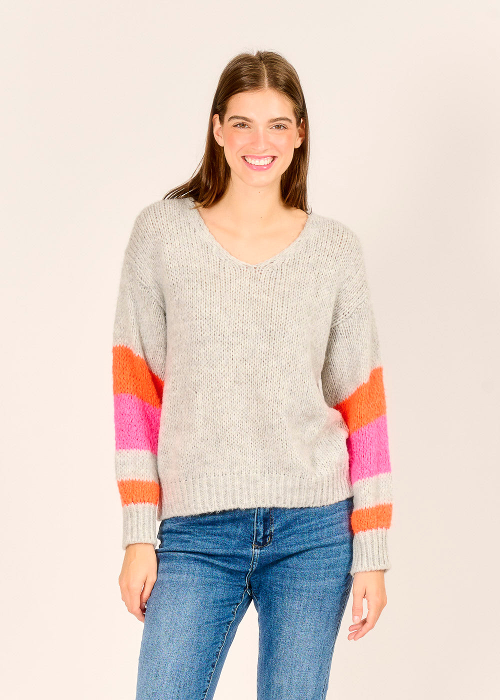 Füge deiner Garderobe einen Farbtupfer hinzu mit unserem Pullover in meliertem Grau. Das weiche Material sorgt für ein kuscheliges Tragegefühl und macht ihn zum perfekten Begleiter für kühle Tage. Ein echter Hingucker sind die bunten Ringel in Pink, Orange und Weiß an den Ärmeln. Mit seinem lässigen V-Ausschnitt passt er perfekt zu Jeans und verleiht deinem Outfit einen coolen und entspannten Look.