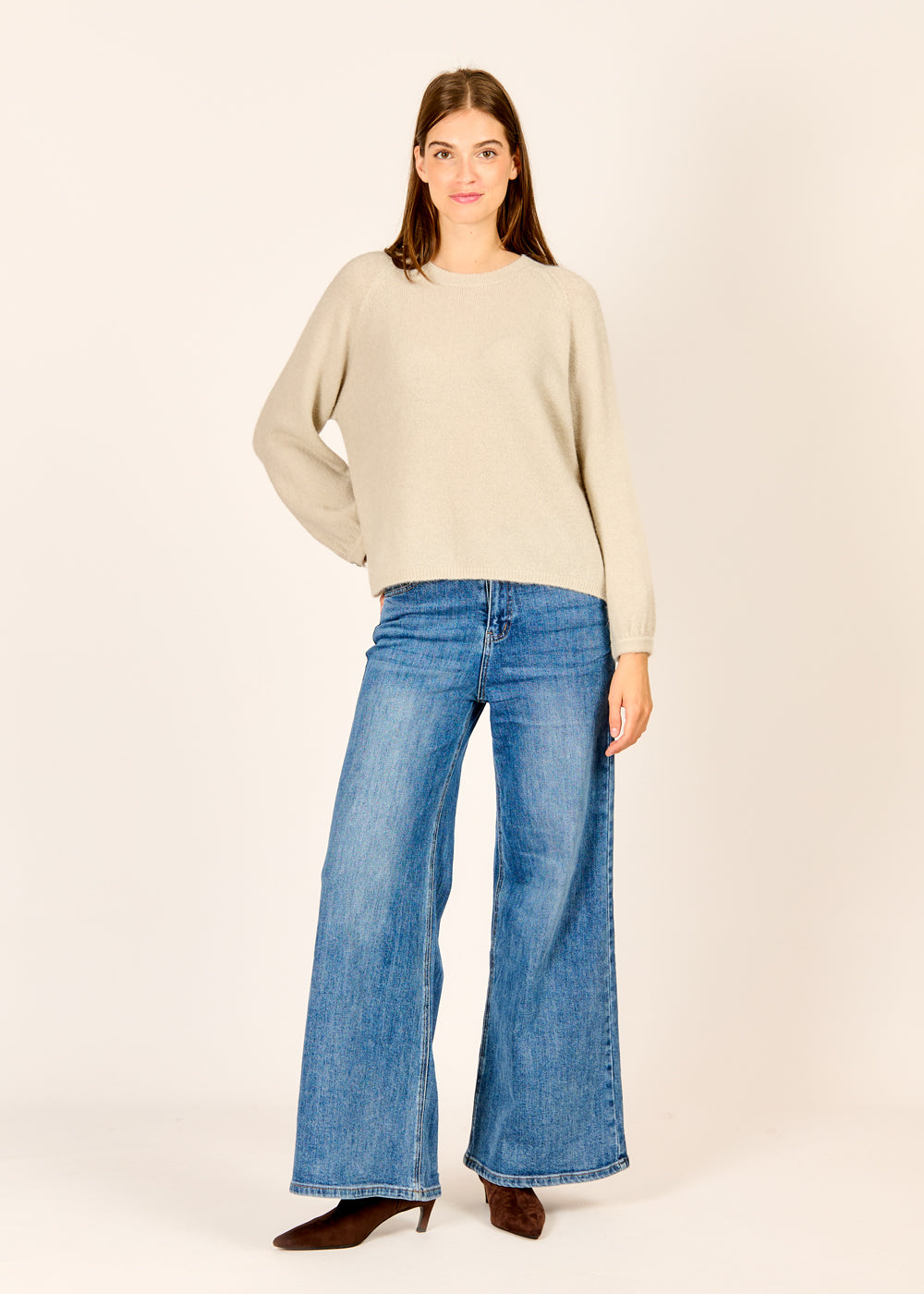 Verliebe dich in unseren gemütlichen Pullover in der edlen Farbe Argento. Das weiche, flauschige Material sorgt für ein wunderbar angenehmes Tragegefühl, während der kleine Knopf am Ärmel ein dezentes und raffiniertes Detail setzt. Mit seinem zeitlosen Design ist dieser Pullover ein vielseitiger Begleiter, der sich perfekt zu Jeans und Röcken kombinieren lässt.