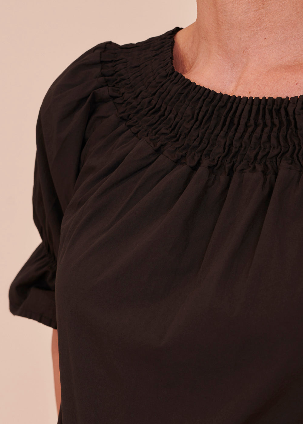 Leichte Carmenbluse in einem wunderschönen Design. Die Bluse hat einen Rundhals-Ausschnitt mit Gummizug, der variable auch mit entblößten Schultern getragen werden kann. Die 3/4- Ärmel eignen sich perfekt für die heißen Sommertage.